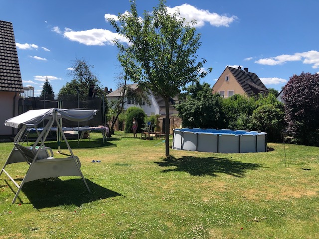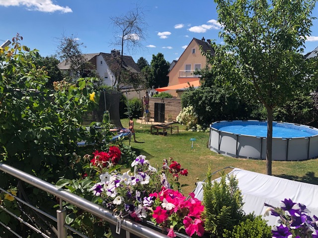 Garten vom Balkon aus. Im Schatten der großen Markise lässt es sich gut aushalten.
